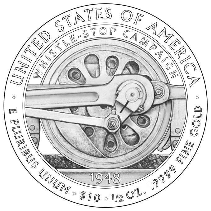 The reverse features a locomotive wheel moving along railroad tracks, representing Mrs. Truman’s support for her husband on his 1948 whistle stop campaign trip for re-election as president.