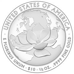 The reverse features the saucer magnolia Mrs. Kennedy chose to be planted in the White House garden and near the eternal flame at her husband’s grave at Arlington National Cemetery. The petals stretch across the globe, its tips connecting the points of some of her most notable diplomatic visits.