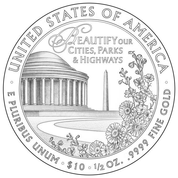 The reverse depicts the Jefferson Memorial, Washington Monument, and flowers in reference to Mrs. Johnson’s efforts in the beautification and conservation of America, which began in Washington, D.C.