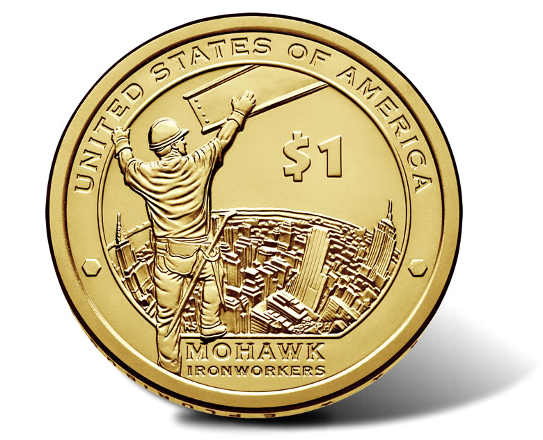 Reverse designs on the 2015- and 2016-dated Native American $1 Coins became public in September 2014. This year’s design won among 20 candidates. It depicts a Mohawk ironworker reaching for an I-beam that’s swinging into position, with rivets on the left and right sides of the border, and a high elevation view of the city skyline in the background. Inscriptions include UNITED STATES OF AMERICA and $1. The reverse design is the work of Ronald D. Sanders with Phebe Hemphill sculpting.