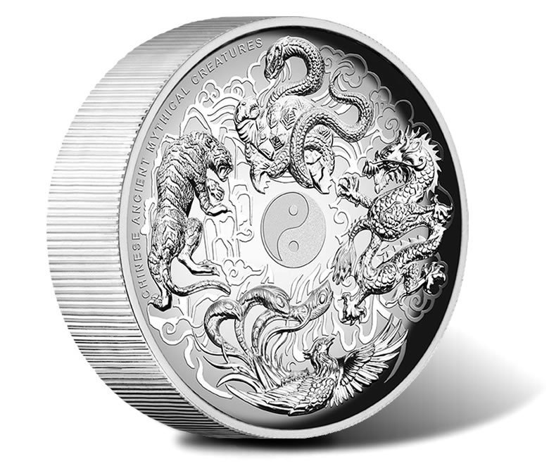 Four Chinese ancient mythical creatures circle a yingyang symbol on a new five-ounce, high-relief silver coin from the Perth Mint of Australia.