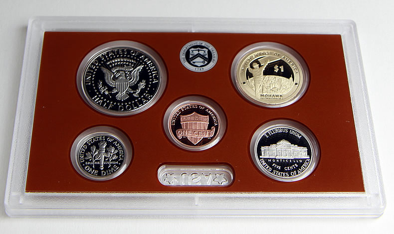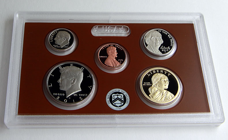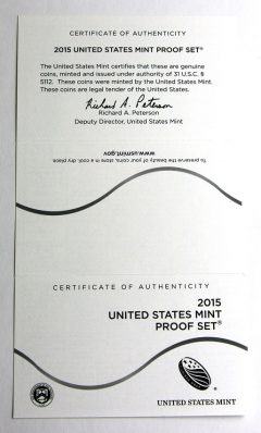 Inside the set are proofs of this year’s $1 coins, 2015 America the Beautiful Quarters, and 1c, 5c, 10c, and 50c coins. Proof coins feature frosted designs that contrast against mirror-like backgrounds.