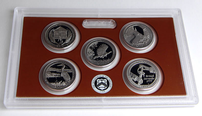 These next two photos show the 2015 quarters honoring Homestead National Monument of America Quarter (Nebraska), Kisatchie National Forest Quarter (Louisiana), Blue Ridge Parkway Quarter (North Carolina), Bombay Hook National Wildlife Refuge Quarter (Delaware), and Saratoga National Historical Park Quarter (New York).