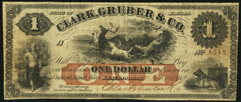 - A $1 note issued by Clark, Gruber & Co. from Leavenworth, Kansas