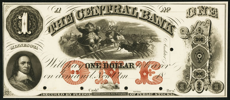 Then there is the only Minnesota "Santa Claus" note known to exist, a $1 showing the Type III style Saint Nick. It should realize more than $25,000.