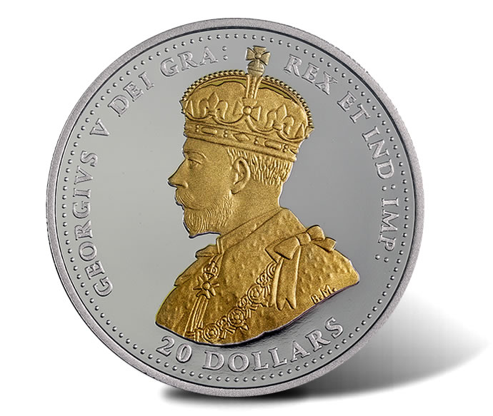 As a reminder of the centennial remembrance of World War I, the obverse offers the effigy of King George V by Sir E. B. MacKennal. The royal portrait is also enhanced with selective gold plating.