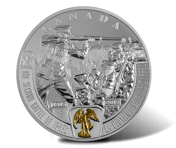 Created by Canadian artist Silvia Pecota, the reverse of this latest coin shows Canadian forces as they would have appeared at the second battle of Ypres. Inscriptions around the design read: CANADA, 1915, 2015 and the SECOND BATTLE OF YPRES in both English and French. At the bottom, selective gold plating highlights the winged figure of "Victory."