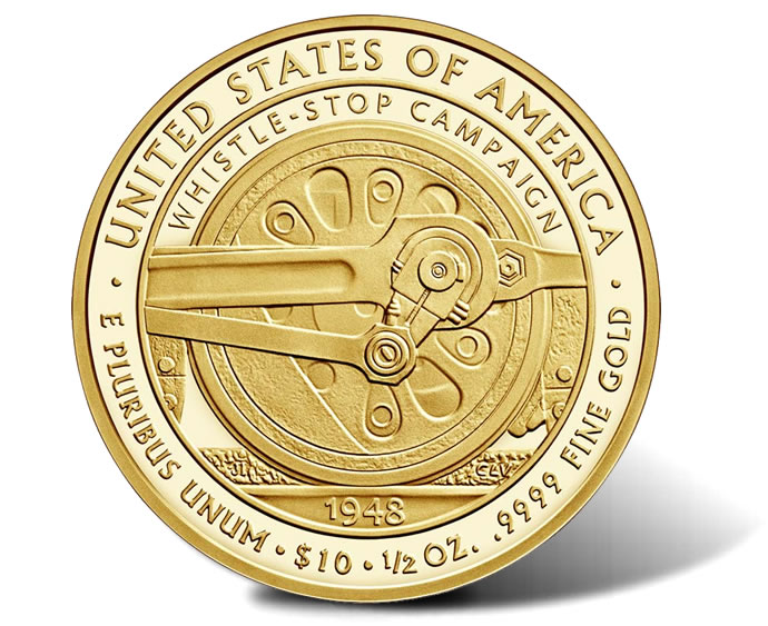 Iskowitz also designed the coins’ reverse, which depicts Bess’ support for the 1948 whistle stop campaign to re-elect her husband as President. Inscriptions read: "UNITED STATES OF AMERICA," "WHISTLE STOP CAMPAIGN," "E PLURIBUS UNUM," "$10," "1/2 OZ.," and ".9999 FINE GOLD." It was sculpted by Joseph Menna.