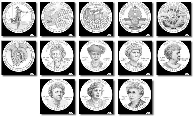 For the Bess Truman coins, two designs won out among thirteen candidate designs that included seven obverses and six reverses.