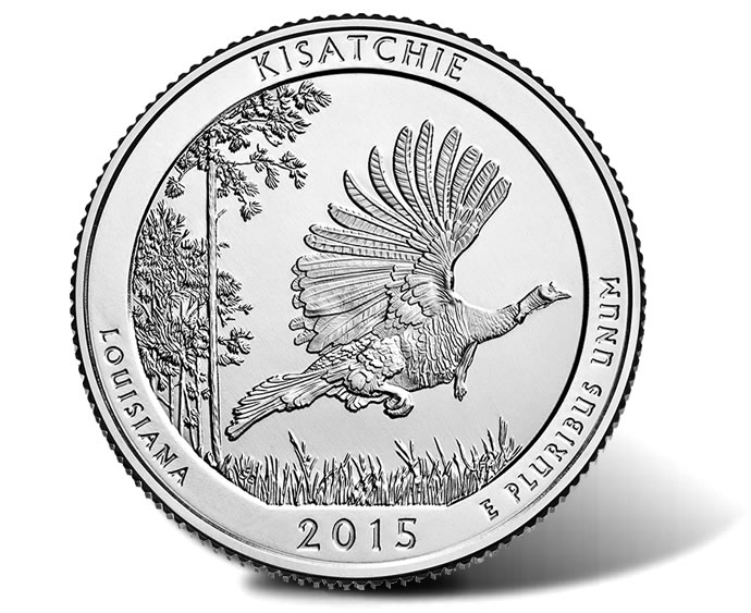 Wednesday’s ceremony offers all attendees an early opportunity to acquire Kisatchie quarters, the second of five 25-cent designs for 2015 and the 27th release in the United States Mint’s series of America the Beautiful Quarters. The coin actually launched into general circulation earlier this week, on April 14, but it’ll likely be months to years before they commonly appear in pocket change across America. On Monday, April 20, Kisatchie quarters will be available from the U.S. Mint in bag and roll products.