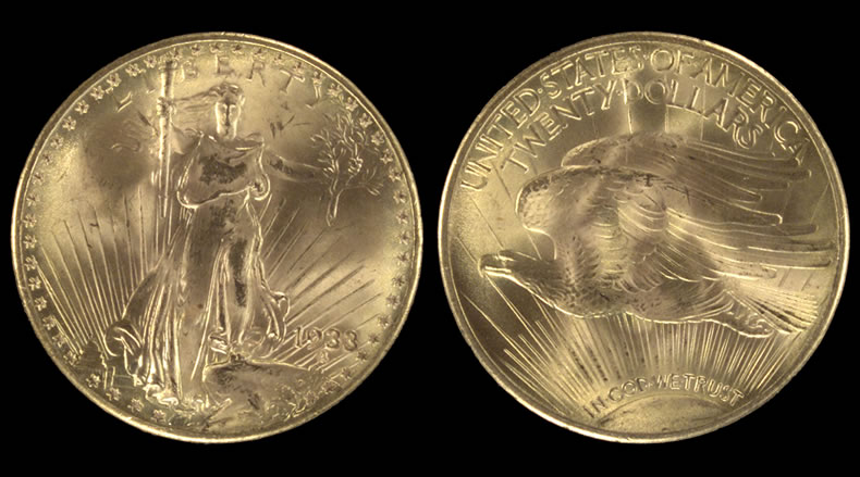 1933 $20 double eagles never made it into circulation. The U.S. Mint in Philadelphia struck about 445,500 but their destiny was the melting cauldrons after President Franklin D. Roosevelt issued an order to abandon the gold standard. Two lawfully left, preserved for the Smithsonian, with the rest sent out for destruction.