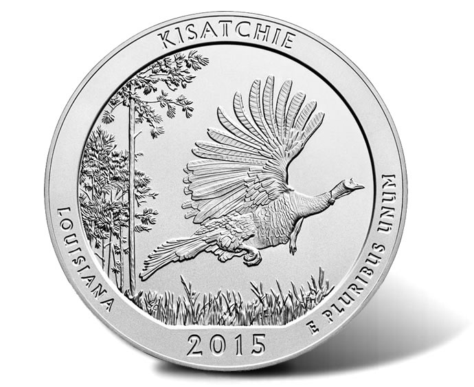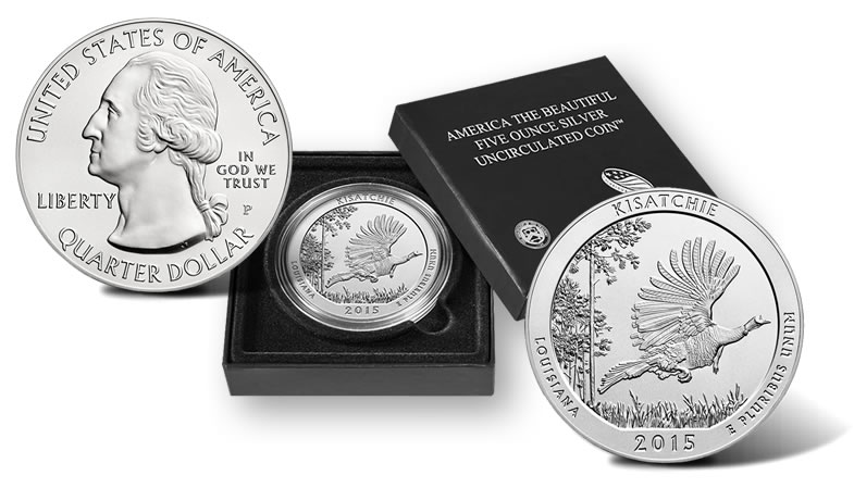 This new Kisatchie silver coin is the second of five 2015-dated releases and the twenty-seventh overall from the Mint’s series of America the Beautiful Five Ounce Silver Uncirculated Coins.