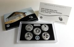 The Kennedy half-dollar, five America the Beautiful Quarters and Roosevelt dime are composed in 90% silver with the remaining balance copper. Their silver weight tallies to 1.338 troy ounces valued at about $23.28, based on today’s London silver price of $17.40 an ounce. The remaining 7 coins are in compositions that match their circulating versions. All 14 coins have a combined face value of $6.91.
