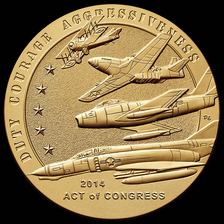 As for the medal itself, two designs won out among 14 candidates. Shown on the obverse (heads side) of the medal are four pilots representing service in World War I, World War II, the Korean War, and the Vietnam War.
