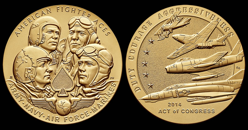 Designed and sculpted by Don Everhart, the reverse (tails side) depicts four aircraft used by American Fighter Aces. Five stars can be seen to the left indicative of the minimum five enemy aircraft that each American Fighter Ace defeated. Inscriptions of DUTY COURAGE AGGRESSIVENESS, 2014, and ACT OF CONGRESS complete the design.