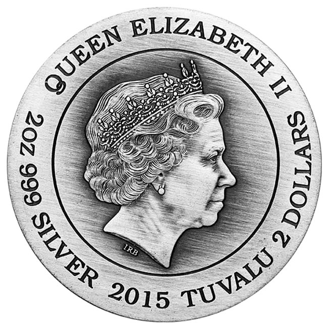The obverse offers Ian Rank-Broadley’s effigy of Queen Elizabeth II. Inscribed around the portrait are QUEEN ELIZABETH II, 2015, 2 oz 999 SILVER and TUVALU 2 DOLLARS. As indicated by the inscription, each is struck as legal tender of Tuvalu. Face value is two dollars.
