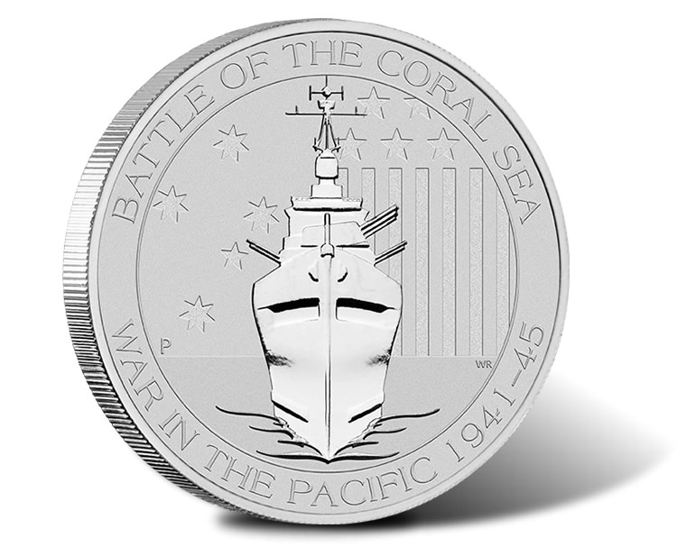 Like last year’s release, the bullion coin portrays a World Wart II naval ship with guns raised against a background comprising representations of the Southern Cross constellation and the Stars and Stripes. Inscriptions around the scene include WAR IN THE PACIFIC 1941-1945 and BATTLE IN THE CORAL SEA.