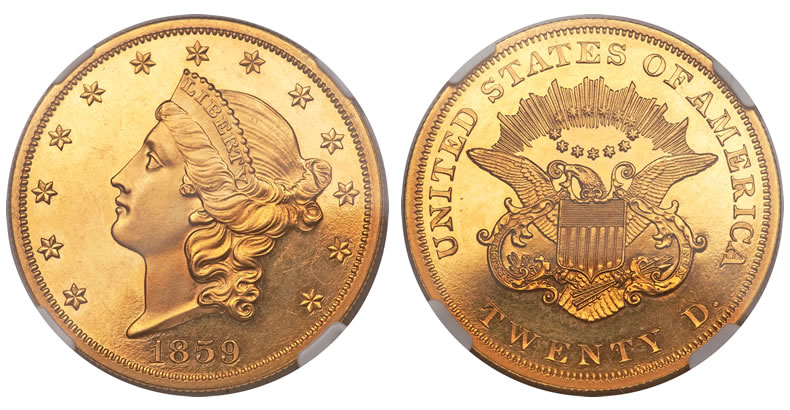 Also, a 1859 $20 Liberty Double Eagle, graded proof 63 Cameo by NGC and last offered in 1962, brought $223,250.