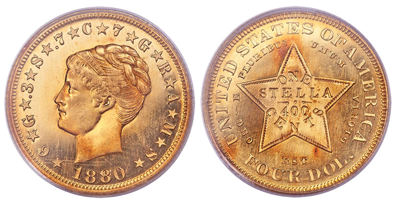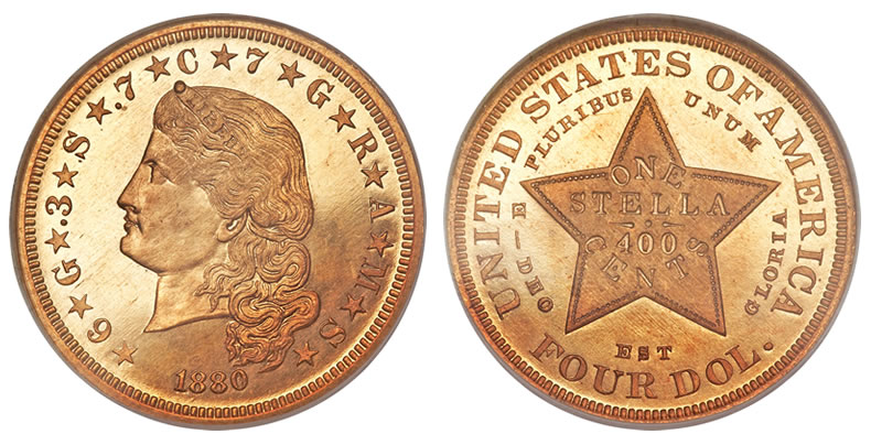 Leading the sales charge was an 1880 $4 Coiled Hair stella. Graded proof 65 by the Professional Grading Service (PCGS), the gold piece is one of nine known examples. It locked in at $1,116,250 when the hammer fell.