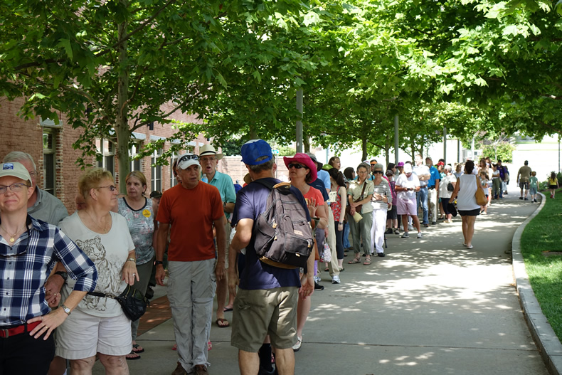 Attendees of the quarter ceremony line up to exchange their paper currency for rolls of new quarters. U.S. Mint photo by Sharon McPike.