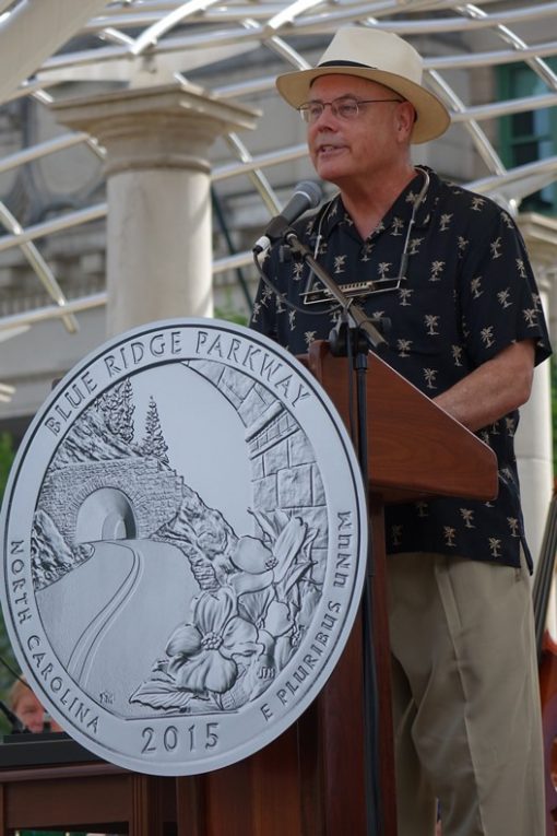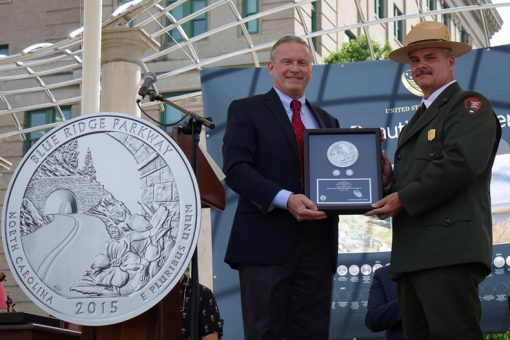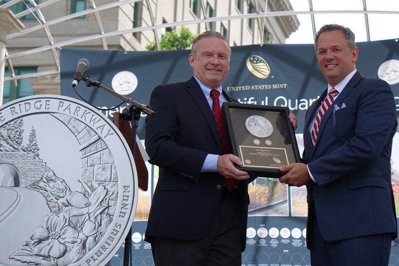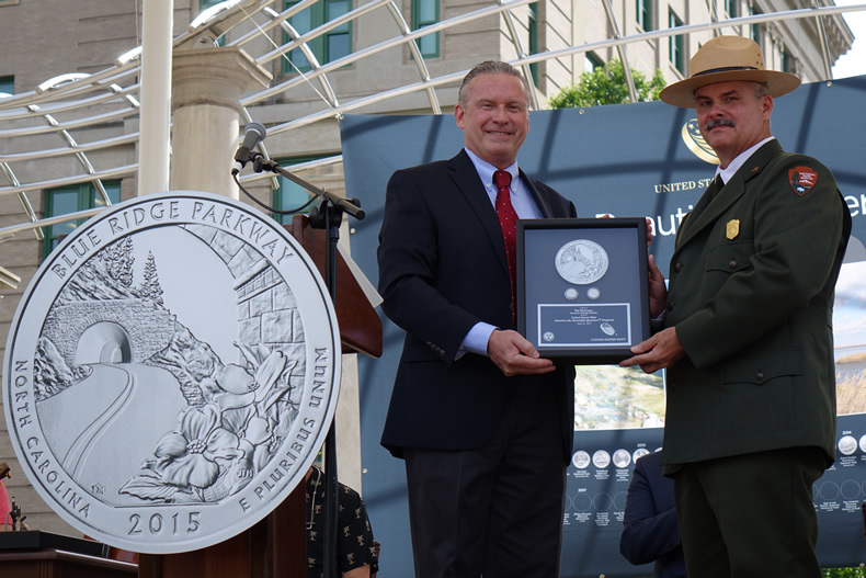 The ceremony was held at Pack Square Park in Asheville, North Carolina, which is near the scenic national parkway that is commemorated on the new coin.