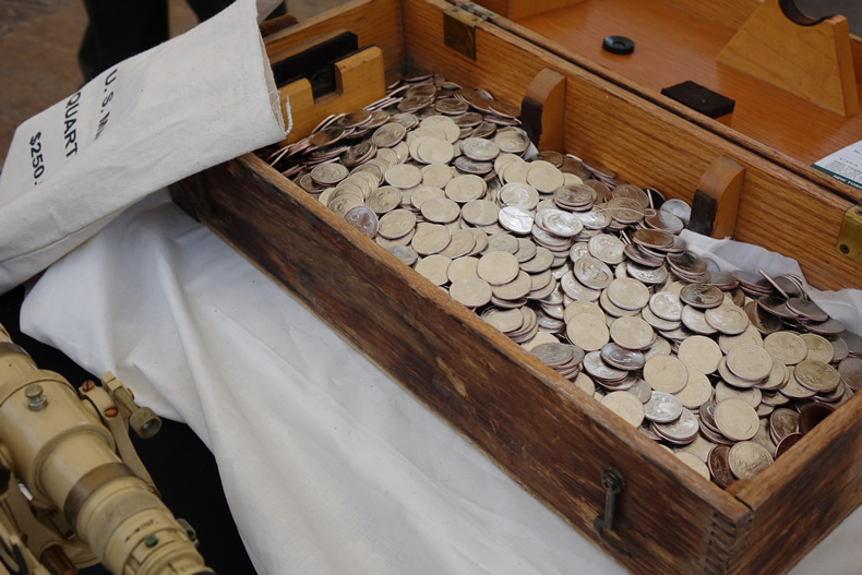 Master of Ceremonies David Holt greets the hundreds of people gathered to launch the quarter. U.S. Mint photo by Sharon McPike. David Holt and the Lightning Bolts entertain the crowd before the quarter. U.S. Mint photo by Sharon McPike. Blue Ridge Parkway quarters fill an antique surveyor’s box at the ceremonial launch of the coin. U.S. Mint photo by Sharon McPike.