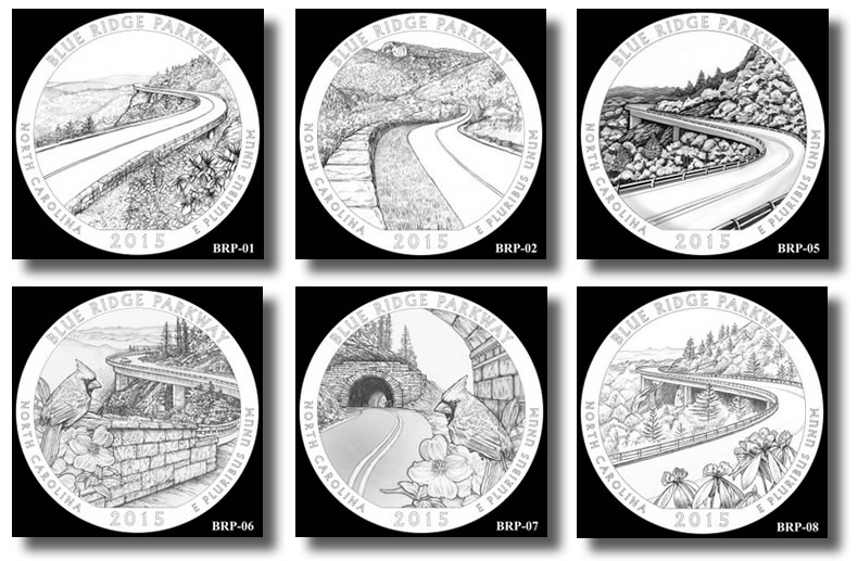 Before the image for the Blue Ridge Parkway quarter was selected, a total of 6 candidate designs went under review. All of them offered a depiction of the roadway and the scenic beauty seen from it.