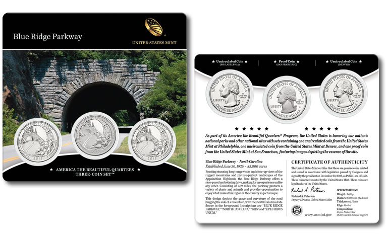 On Thursday, July 2, the United States Mint released the 2015 Blue Ridge Parkway Quarters Three-Coin Set. Quarters of the set commemorate the national roadway found mostly in North Carolina.