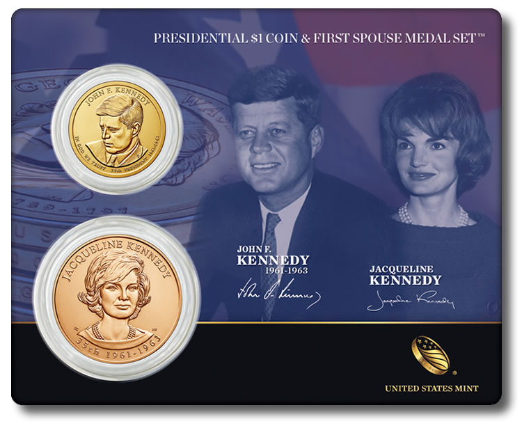 This product for collectors, priced at $9.95, has one uncirculated quality John F. Kennedy Presidential $1 Coin and one Jacqueline Kennedy First Spouse Bronze Medal. These are in a protective card that shows portraits of the President and Mrs. Kennedy, their signatures, historical information, and a U.S. Mint certificate of authenticity.