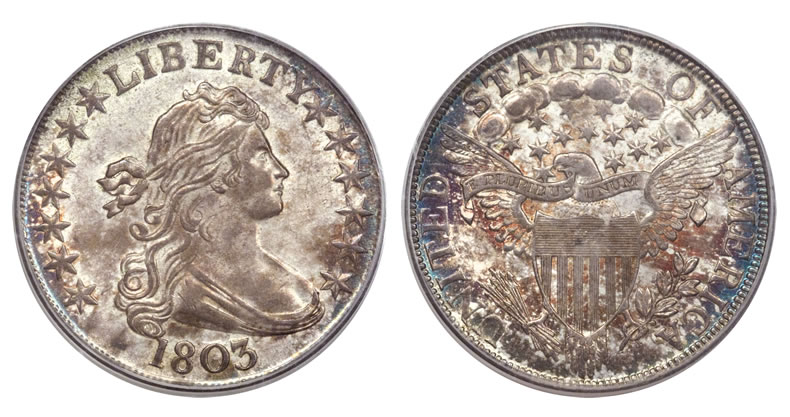 An 1803 Large 3 half-dollar, Large Reverse Stars MS63 PCGS, and one of only six Mint State Large 3 examples known at PCGS, brought $99,875.