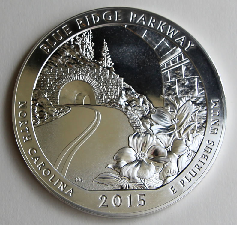Sales of the investment-grade 2015 Blue Ridge Parkway Five Ounce Silver Bullion Coin ended today, July 29, when the "total sold" reached 45,000. This marks the highest level for a coin in the series since 2011.