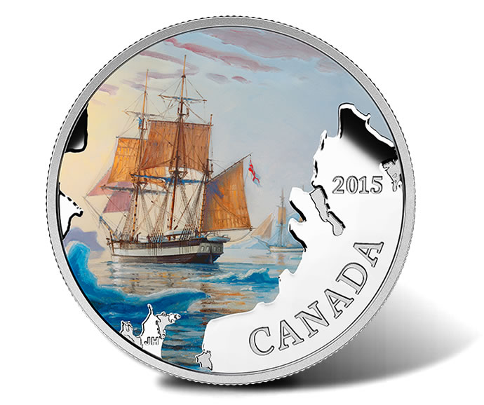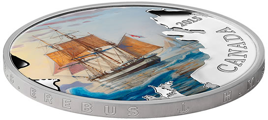 Each Franklin coin offers a reverse design with H.M.S. Erebus in the foreground and H.M.S. Terror in the distance. The image, by Canadian marine artist John Horton, shows both vessels making their way through icy waters. Inscriptions around the scene include CANADA, 2015 and the artist’s initials.