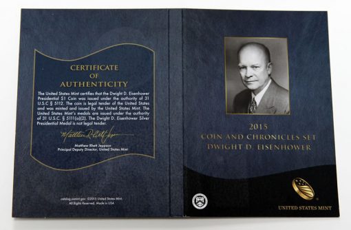 2015 Dwight D. Eisenhower Coin and Chronicles SetThis is a photo of the front and back of the folder, which holds the stamp, reverse proof dollar and silver medal. The U.S. Mint’s Certificate of Authenticity appears on the back.At left is a photo of the back of the sleeve, which holds the folder. It shows coin and medal specifications. At right is the 16-page informational booklet with images from Eisenhower’s life, military career and presidency.