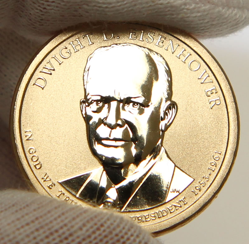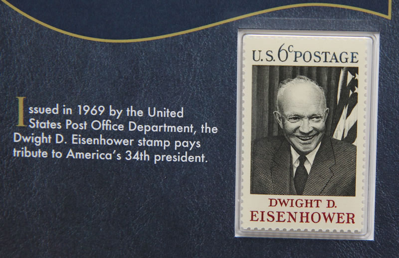 Here are photos of the 2015-P Reverse Proof Dwight D. Eisenhower Presidential $1 Coin (obverse or heads side and reverse or tails side). The reverse proof Presidential $1 is only the second one issued by the U.S. Mint, with the first one in the 2015 Harry S. Truman Coin and Chronicles Set. Opposite of standard proofs, reverse proof coins have frosty fields and raised mirror-like devices.Here are two photos of both sides of the one-ounce, .999 fine Dwight D. Eisenhower Presidential Silver Medal. The medal is a duplicate of the inaugural Eisenhower bronze medal from 1953.Here is a photo of the Dwight D. Eisenhower 1969 6c postage stamp