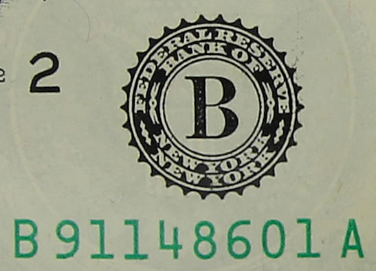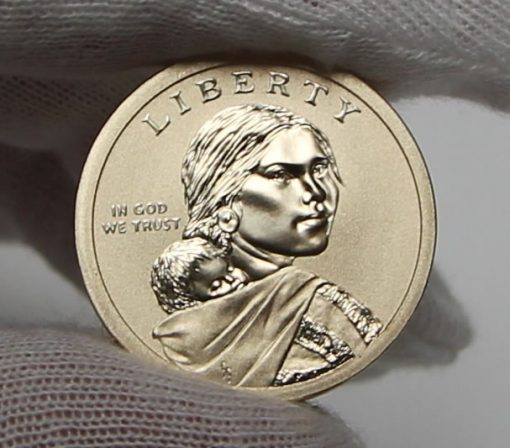 The set’s $1 coin and $1 bill are in a tri–fold presentation folder containing historical information about the Mohawk Ironworkers, product specifications and a U.S. Mint certificate of authenticity. The folder ships inside a sleeve, which is shown left. The set’s main attraction is its exclusive 2015-W Enhanced Uncirculated Native American $1 Coin from the U.S. Mint facility at West Point, which normally produces only platinum, gold and silver coins. The West Point Mint is not a complete stranger to $1 coins featuring Sacagawea, having struck some test 22-karat gold examples with a dozen of them flying in space aboard Space Shuttle Columbia on mission STS-93 in July 1999. Above are photos of an obverse (heads) and reverse (tails). The $1 coin’s obverse retains the Sacagawea design by sculptor Glenda Goodacre first introduced in 2000. The reverse depicts a Mohawk ironworker reaching for an I-beam that is swinging into position, with rivets on the left and right side of the border, and a high elevation view of the city skyline in the background. Ronald D. Sanders designed it and Phebe Hemphill executed its sculpting. The photos below show how the coin’s enhanced uncirculated finish appears under varying angles of light. Edges of dollar coins bear the year of minting, the mint mark for the U.S. Mint facility where it was produced and E PLURIBUS UNUM. In this photo, you can see the year ‘2015’ and ‘W’ for the West Point Mint’s mint mark. Each set has a Series 2013 $1 Federal Reserve note from the Federal Reserve Bank of New York. This photo shows the note’s face. Each note has a beginning serial number of ‘911’ in honor of the Mohawk Ironworkers recovery efforts following the collapse of the World Trade Center twin towers in 2001. Above the serial number, you can see the New York Federal Reserve Bank designation. The back of the dollar