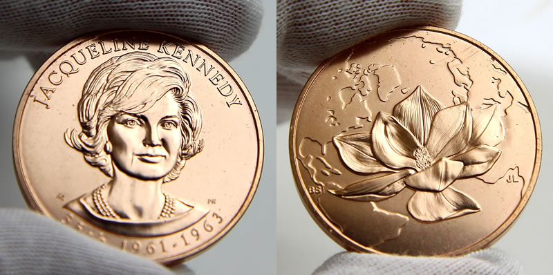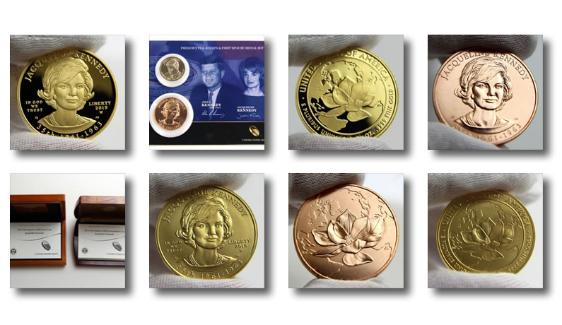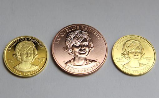This short article presents a photo overview of the bronze medal and two First Spouse Gold Coins featuring Jacqueline Kennedy, the wife of John F. Kennedy who was the 35th President of the United States.