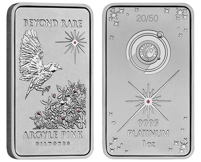Also appearing from the Perth Mint of Australia is the Argyle 1oz Platinum Ingot with Pink Diamonds and the Argyle 1oz Gold Ingot with Pink Diamonds.