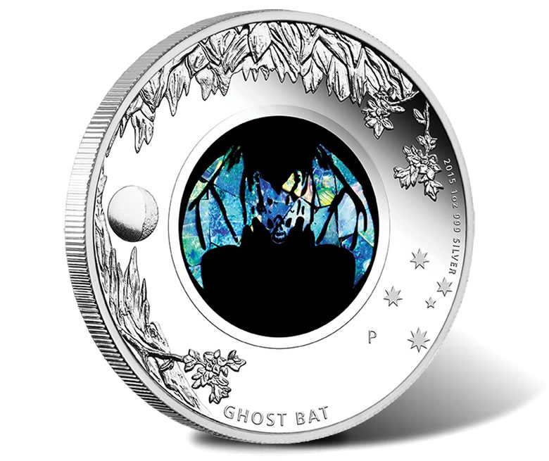 The Perth Mint’s Australian Opal series comes to a close with the 2015 Ghost Bat Silver Proof Coin. Seen in the center of the coin is an inner panel of pure Australian opal which includes the likeness of a flying Ghost Bat.