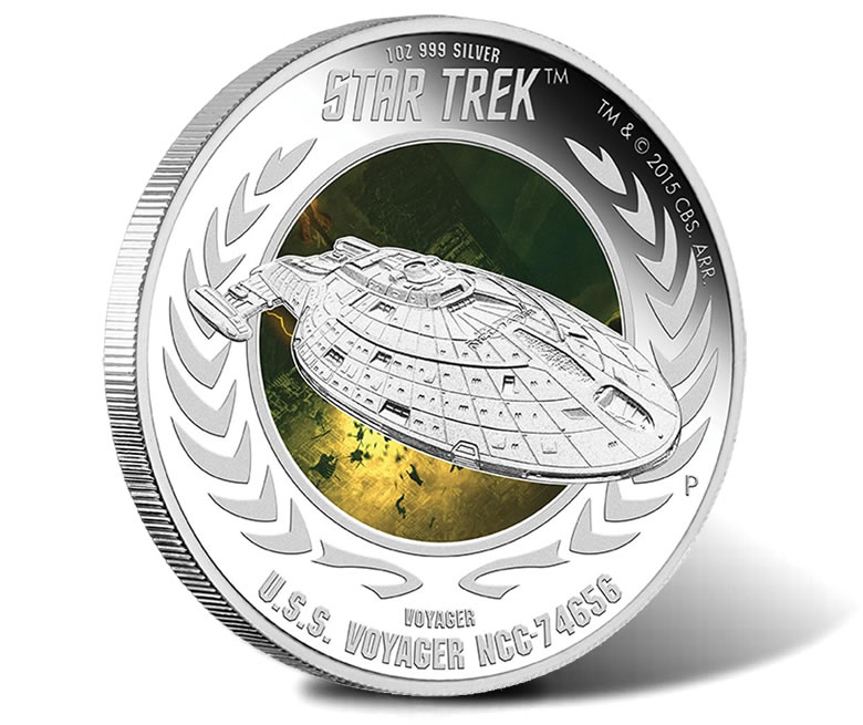 The Star Trek series continues with two coins depicting the starship U.S.S. Voyager and its captain, Kathryn Janeway. Both were featured in the television series Star Trek: Voyager which aired from 1995 through 2001.