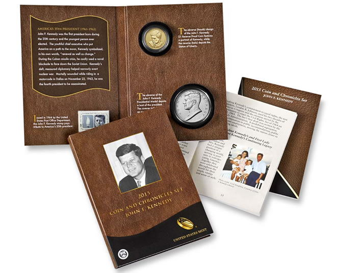 Priced at $57.95, sets include a 2015-P Reverse Proof John F. Kennedy Presidential $1 Coin, a one-ounce .999 fine Kennedy silver medal, and a 1964 5-cent Kennedy U.S. postage stamp.