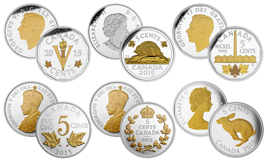 The six 2015-dated coins, struck in 1-ounce of 99.99% pure silver with selective gold plating, feature the original imagery as found on Canadian Nickels since 1908. That includes both their unique reverses and obverse effigies of the reigning monarch at the time of each nickel’s original issue date. Series coins also feature a 40-mm diameter, which is twice as large as the original nickels.