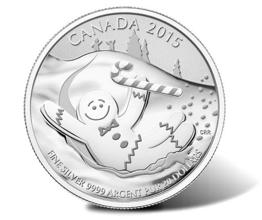 Designed by Chris and Rosina Reid, the reverse or tails side shows the gingerbread man holding a candy cane as he joyfully slides down a snow hill. Inscriptions around the design read: CANADA 2015, FINE SILVER 9999 ARGENT PUR and 20 DOLLARS.
