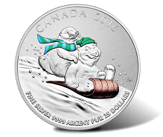 Designed by Jesse Koreck, the reverse of the $25 coin depicts a beaver and polar bear joyfully sledding down a snow hill. Surrounding inscriptions read CANADA 2016, FINE SILVER 9999 ARGENT PUR and 25 DOLLARS.