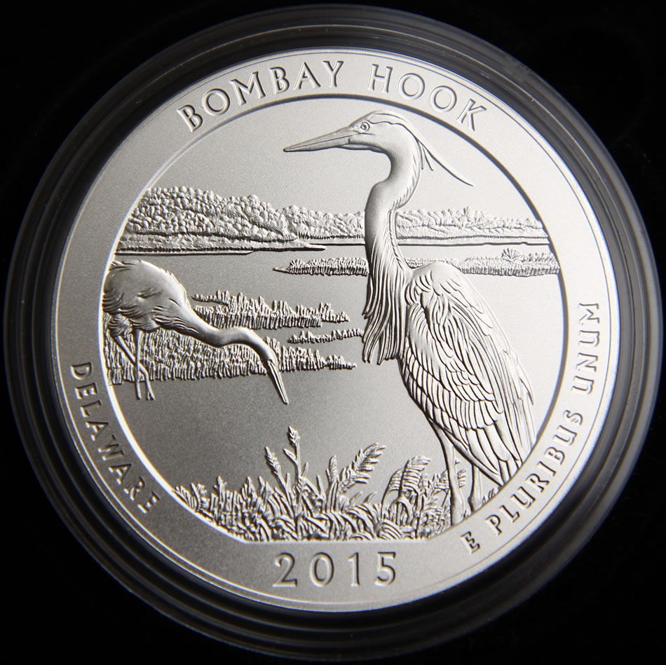 The U.S. Mint introduced the 2015-P Bombay Hook Five Ounce Silver Uncirculated Coin on Thursday, Oct. 8. It also moved slower out of the gate, logging 4-day sales of 14,433 compared to the 15,295 start of the previous coin honoring Blue Ridge Parkway in North Carolina. Going back further, the issue commemorating Kisatchie National Forest in Louisiana started at 15,622 and the first 2015-dated release depicting Homestead National Monument of America in Nebraska debuted at 16,216.
