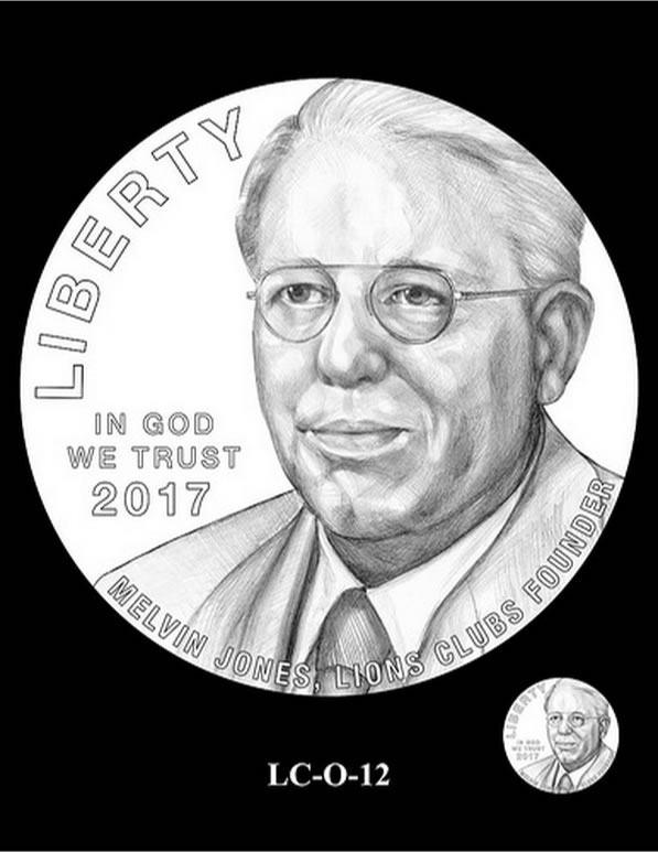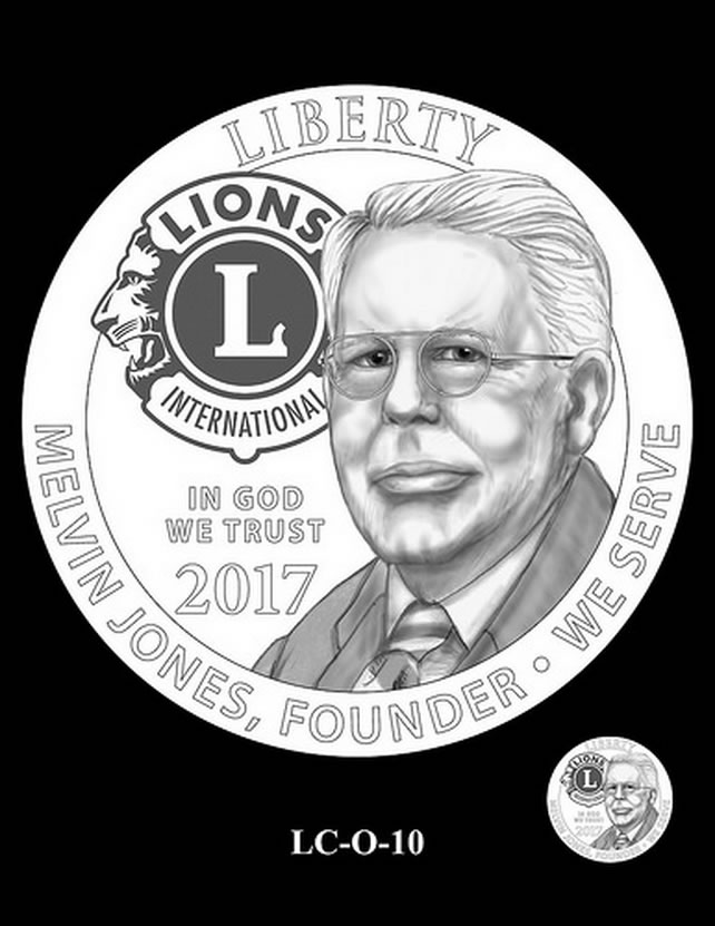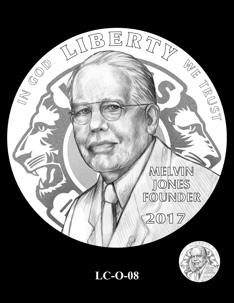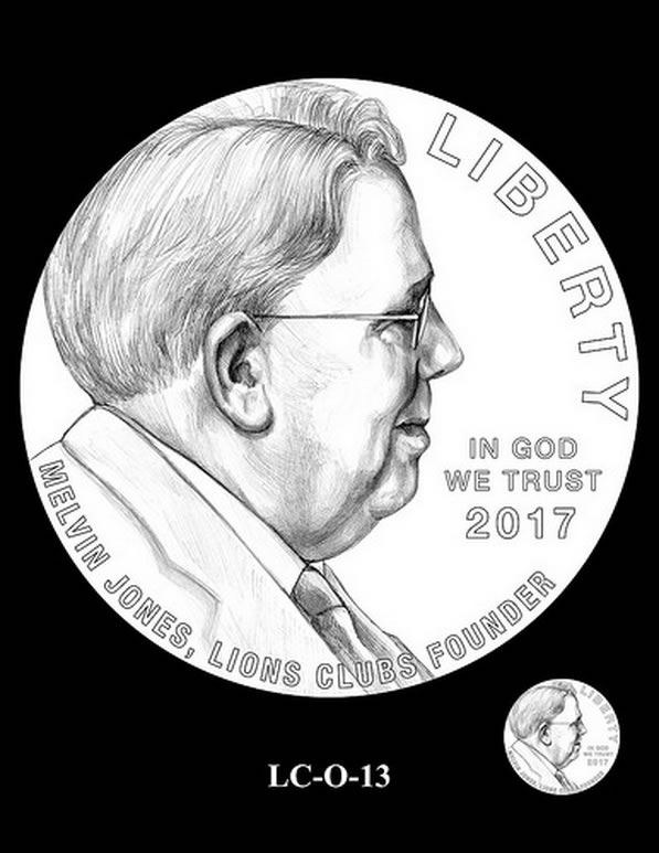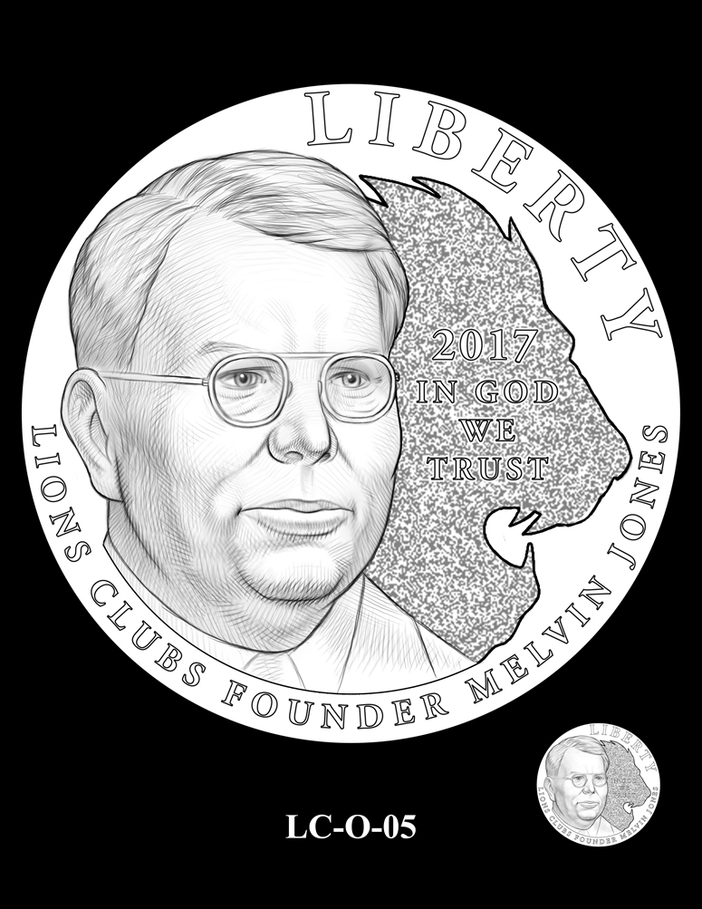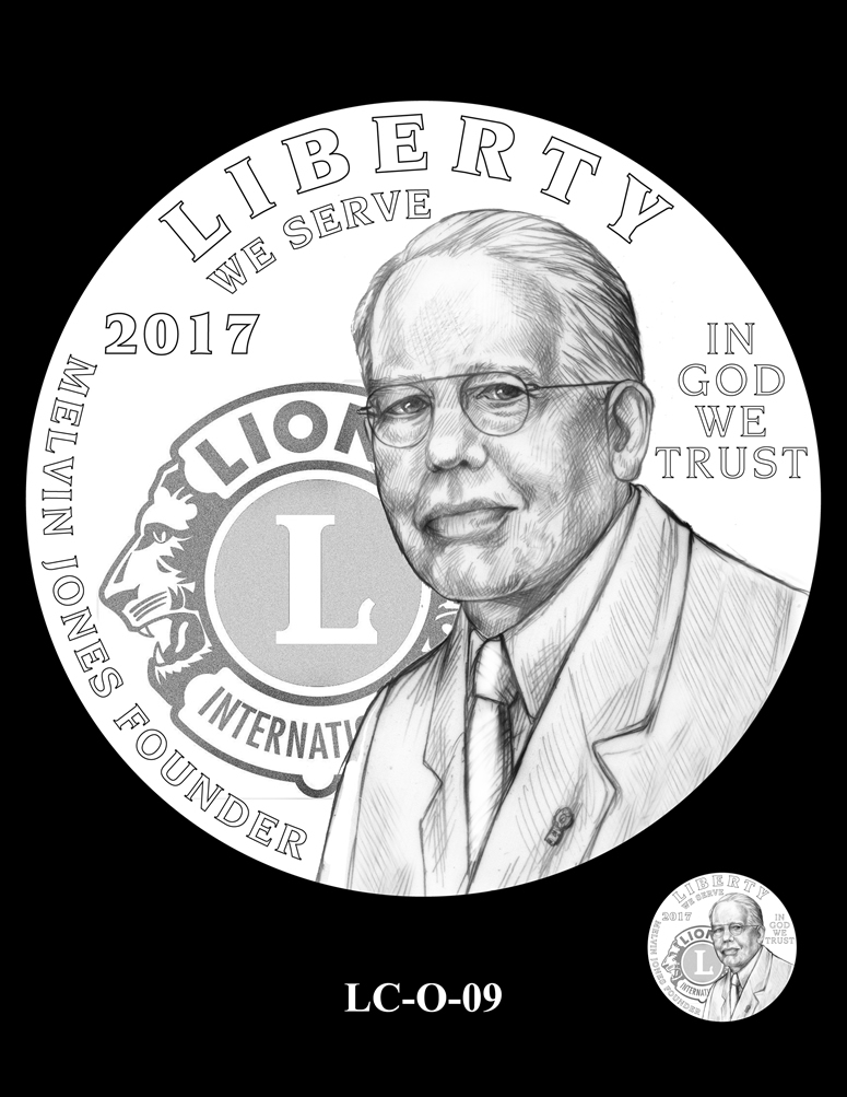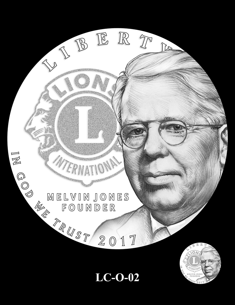 LC-O-02, the recommended obverse by all parties, depicts Melvin Jones paired with the Lions Clubs logo. An additional inscription reads, "MELVIN JONES FOUNDER."
