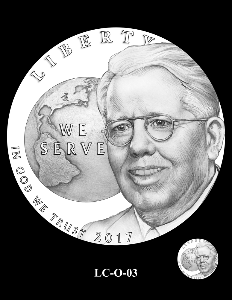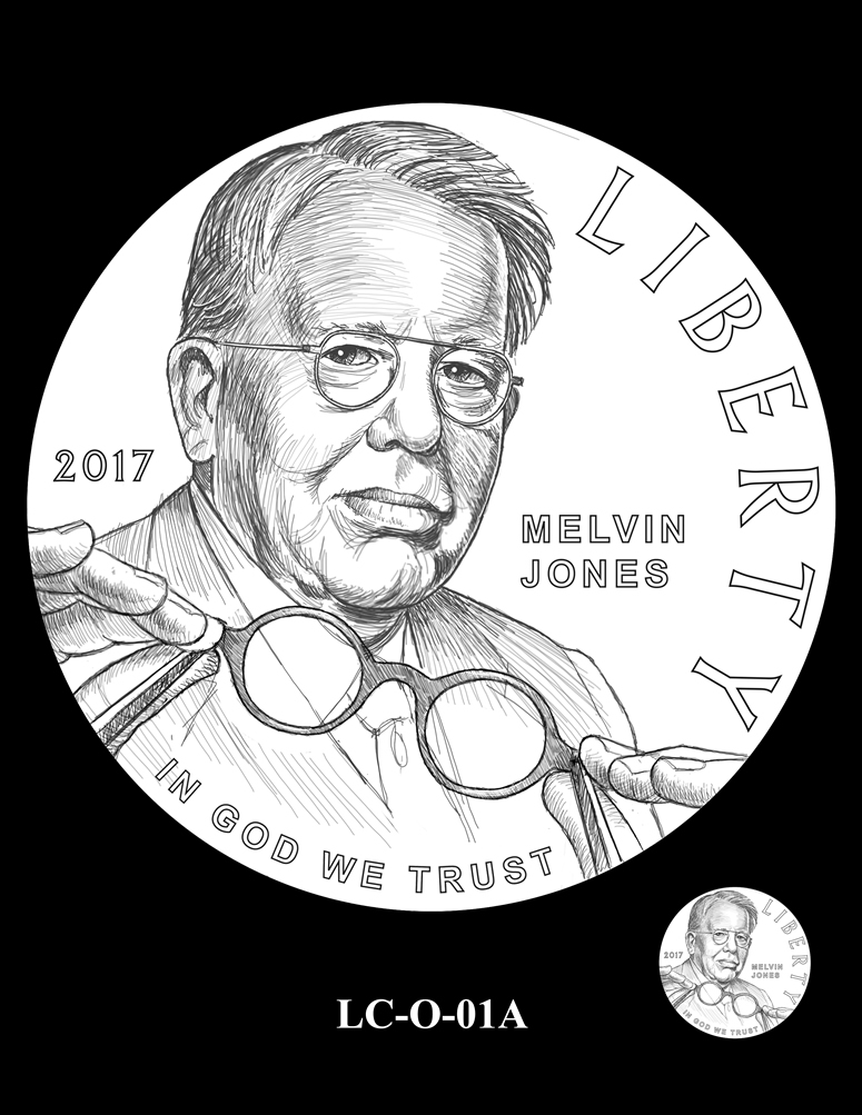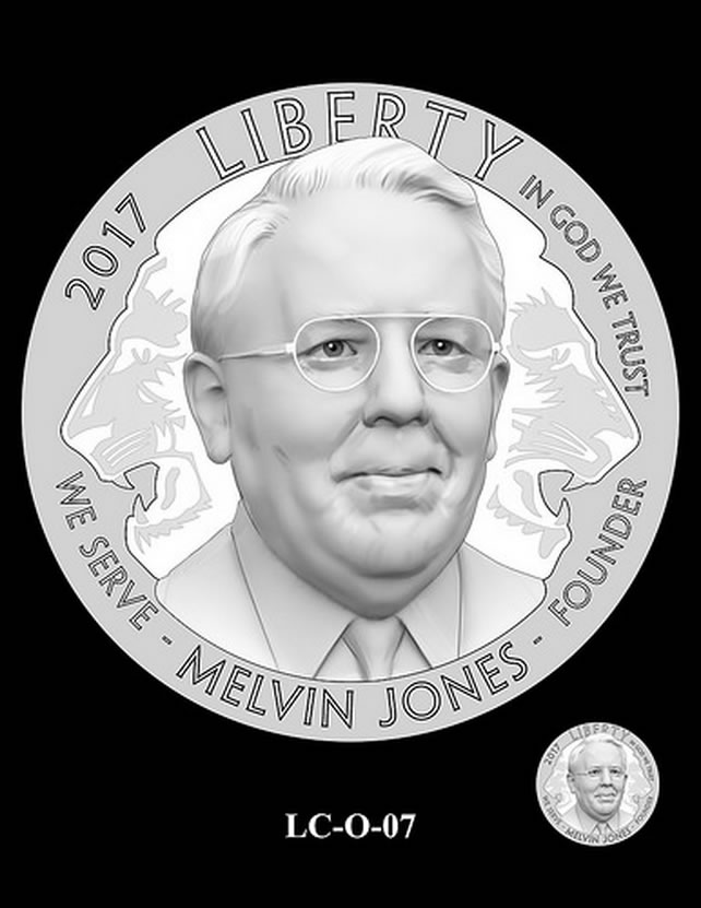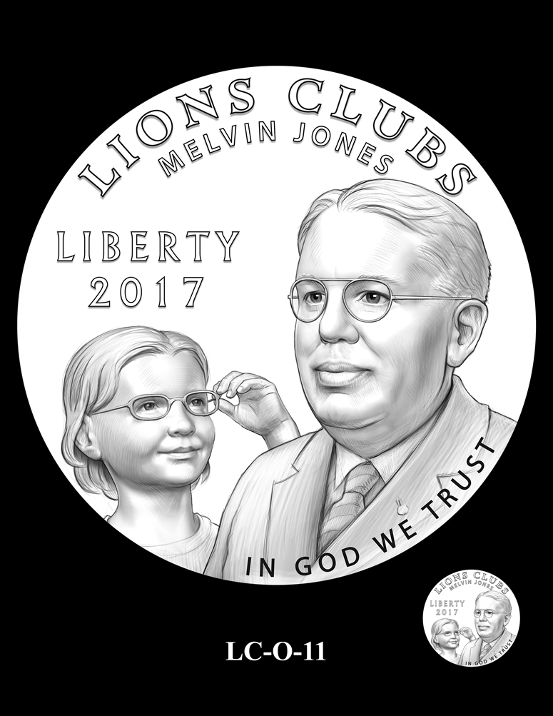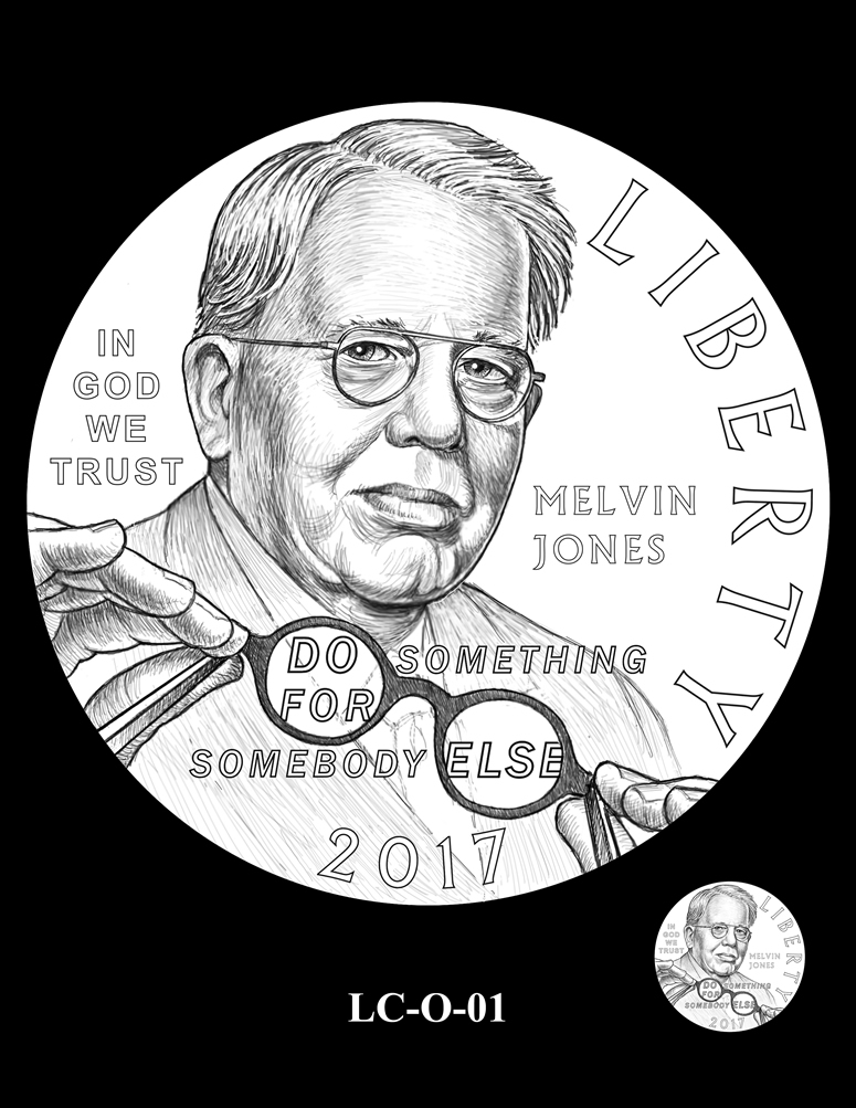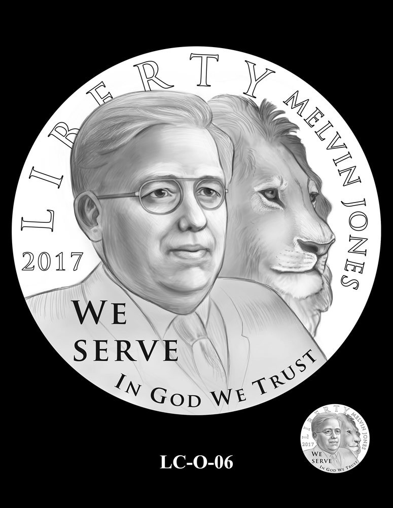 LC-O-02, the recommended obverse by all parties, depicts Melvin Jones paired with the Lions Clubs logo. An additional inscription reads, "MELVIN JONES FOUNDER."
