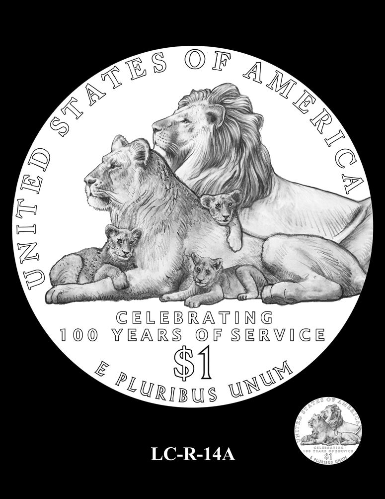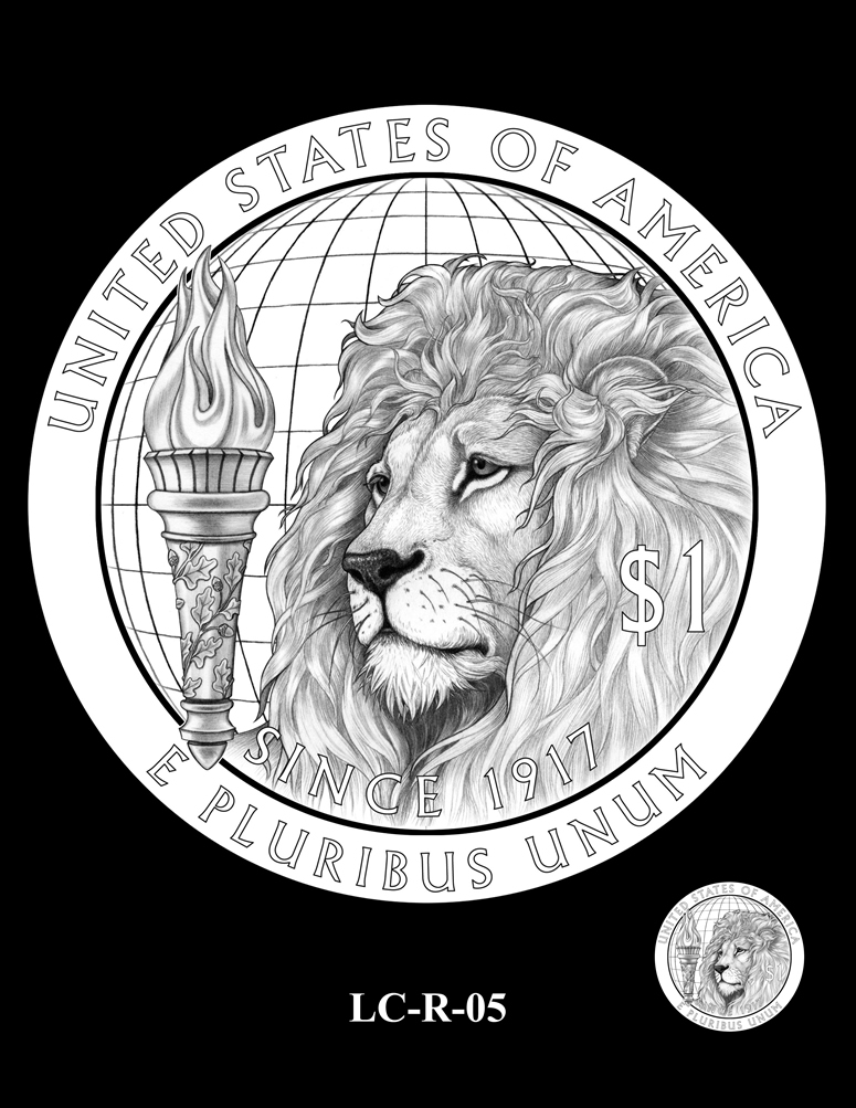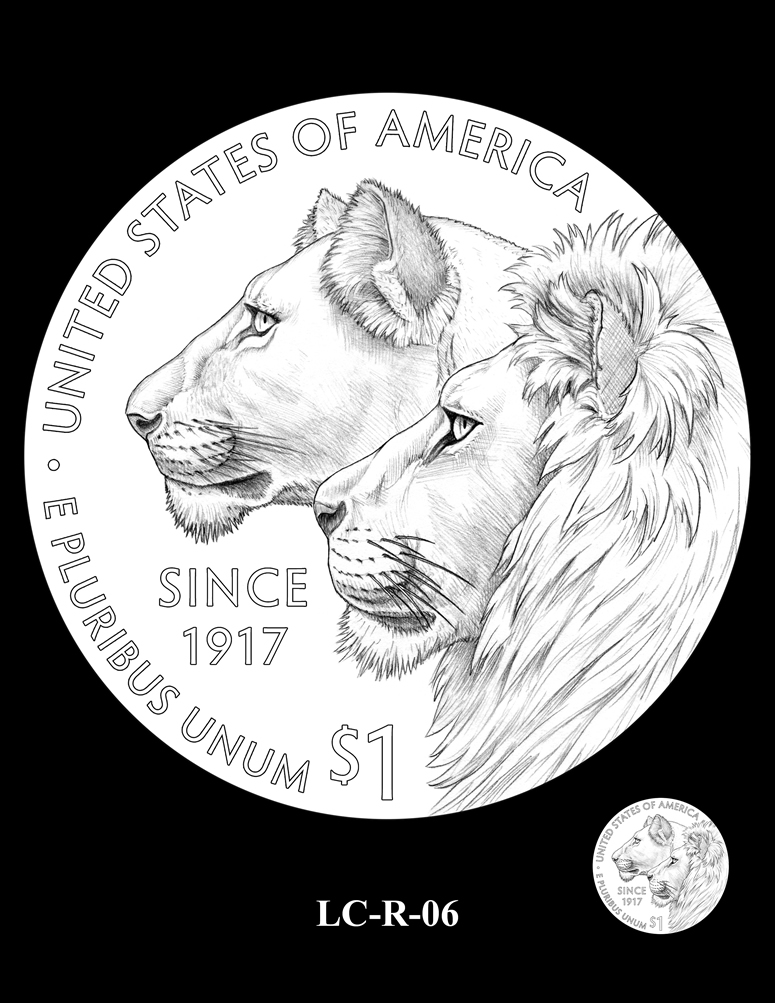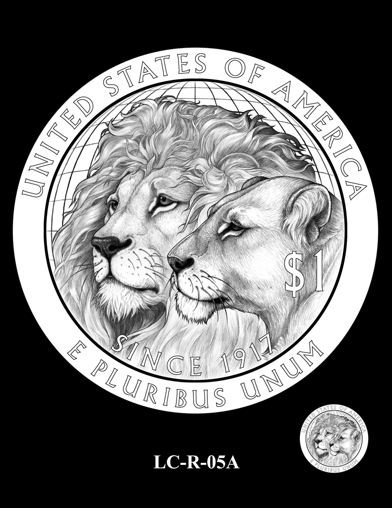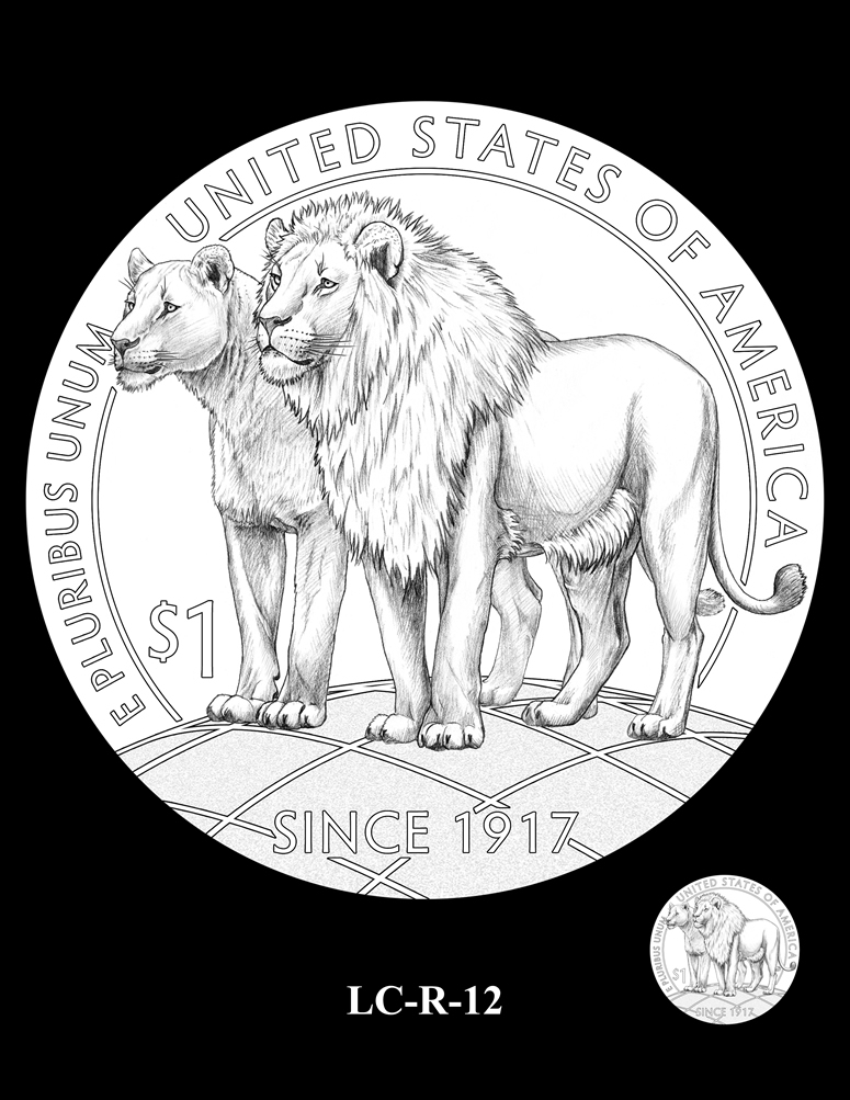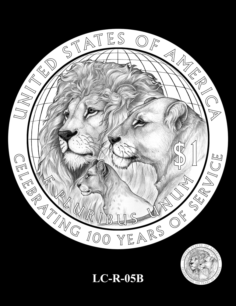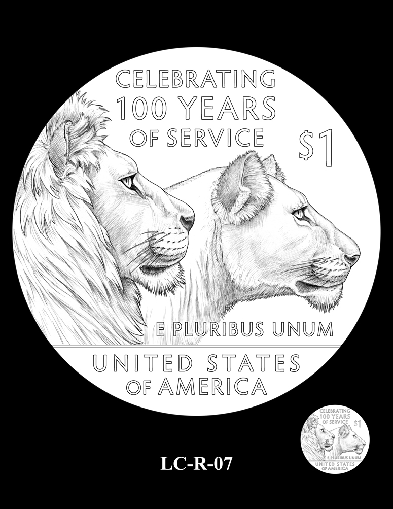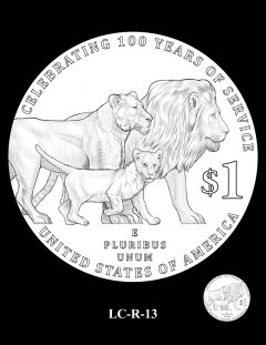 LC-R-05, LC-R-05A and LC-R-5B feature a lion or lions set against a globe. In design LC-R-05 a torch accompanies the lion, symbolizing Hellen Keller’s charge to Lions to become "knights…in the crusade against darkness," through their aid to the blind and visually impaired. LC-R-05 and LC-R-05A include the inscription "SINCE 1917." LC-R-5B, the Lions Clubs’ preferred reverse design, features a cub accompanying a male and a female lion, and the inscription "CELEBRATING 100 YEARS OF SERVICE."