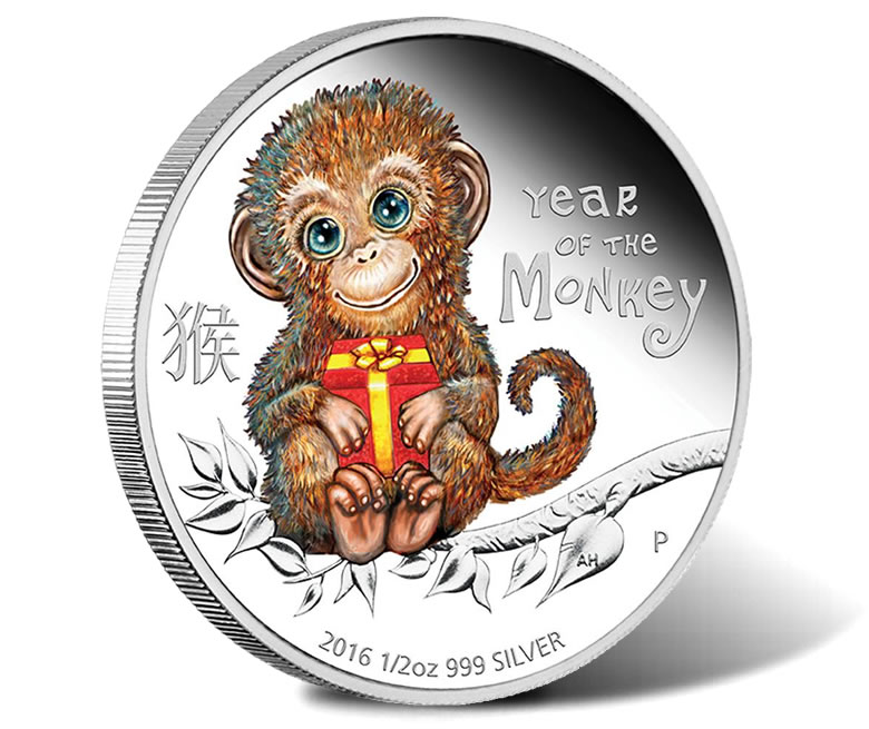 An adorable baby money appears on this 50-cent silver coin. Holiday-themed, the monkey is shown holding a present.