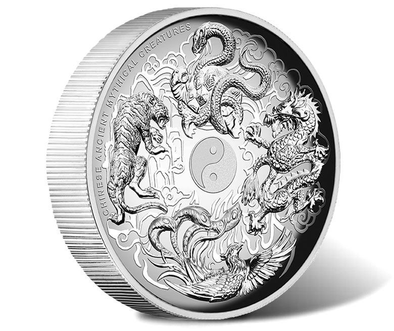 Four Chinese ancient mythical creatures encircle a yingyang symbol on this high-relief coin in one ounce of 99.9% pure silver.