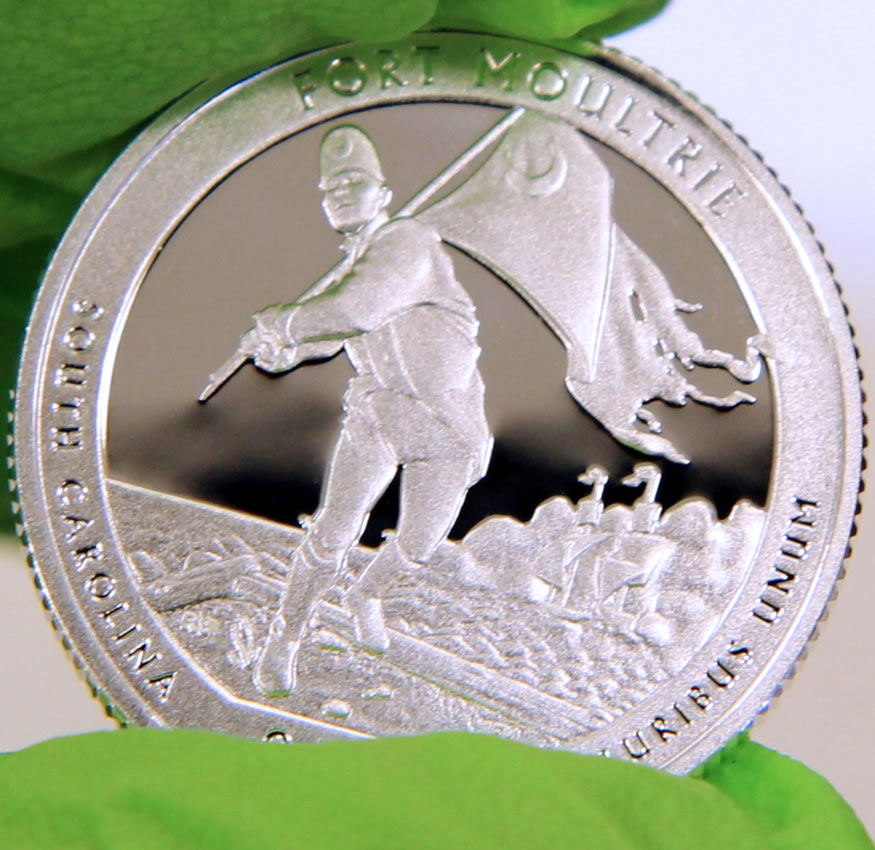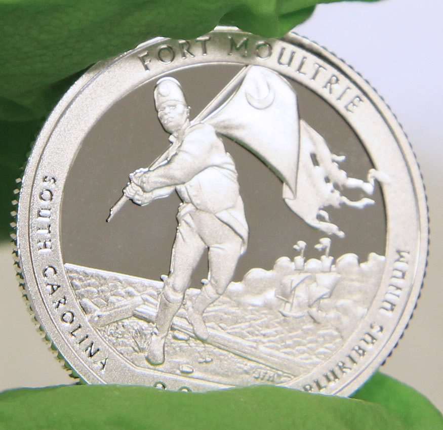 Proof coins feature frosted designs and mirror-like backgrounds, creating a cameo-like appearance that coin collectors find appealing. Below are some photos of a proof Fort Moultrie quarter.